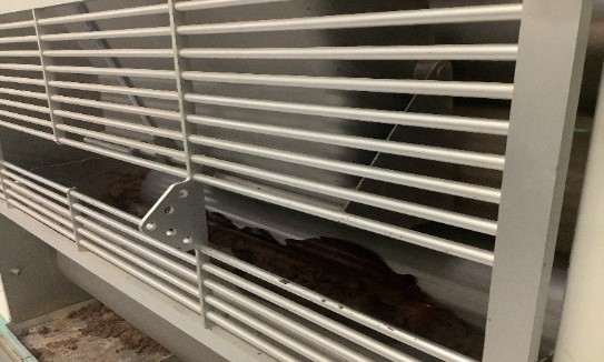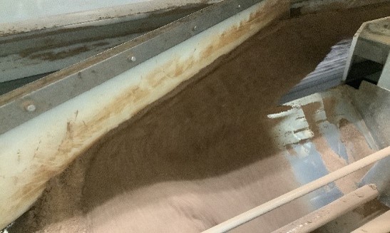 ②巨大なローラーで生地を粉砕してフレーク(さらさらの粉状)にします。
