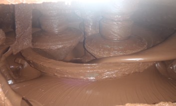 ③コンチングマシンで長時間練り上げ、風味と流動性を高めて、おいしいチョコレートペーストの完成です。